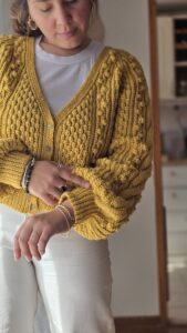 Te propongo tejamos un cárdigan manga ranglan, siguiendo un patrón con descripción vuelta por vuelta. Trabajaremos con vueltas cortas, y trenzas en relieve. Para tejerlo contaras con descripción vuelta por vuelta y gráficos de apoyo. Simplemente tendrás que elegir cual es la medida que se ajuste a tu contorno, y a partir de ahí, agarras tus agujas y el hilado, para empezar a tejer el tuyo. Sin hacer ningún tipo de cálculo. Así de simple 🙂