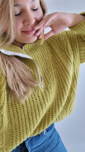 Mi Sweater esta tejido con Katia Tirol semigrueso. Su composición es lana y acrílico en partes iguales. Vos vas a poder tejerlo en el material que prefieras.